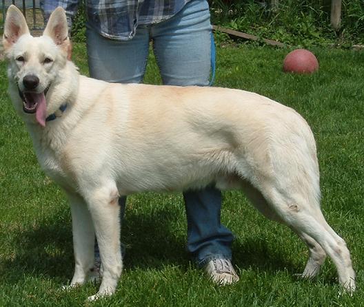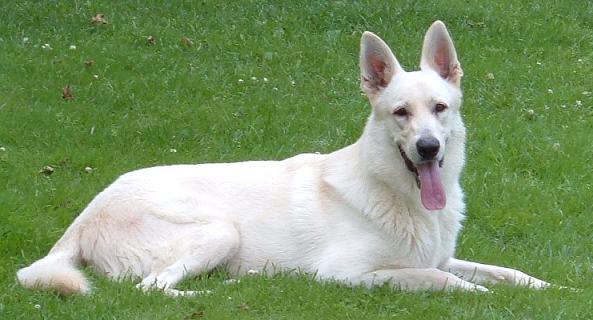 | Picture above taken May 2007 Kyzer has an awesome temperament, a very social dog he is good with everybody and everything. He is standard size for a male, but is a slow grower. He has excellent black pigment for a solid white, with a black nose, lips and eye rims. Kyzer is producing great looking pups with absolute correct structure (not over angulated or roach backed). Firm straight backs with good movement. Awesome temperaments too! Kyzer has now been placed in a pet home. |